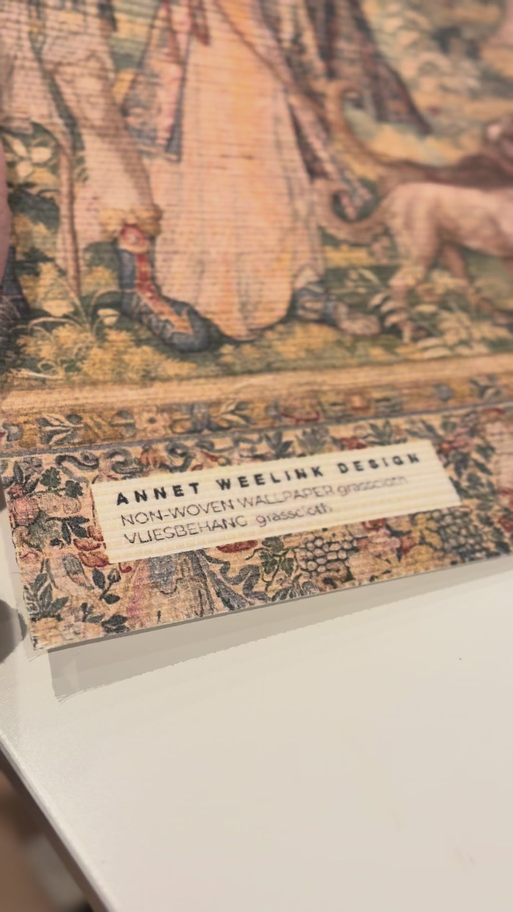 Medieval tapestry-inspired orient scene based on vintage museum imagery. Enhanced and recolored by Annet Weelink to create a rich, decorative composition, printed on luxurious woven grasscloth for a warm and authentic interior.